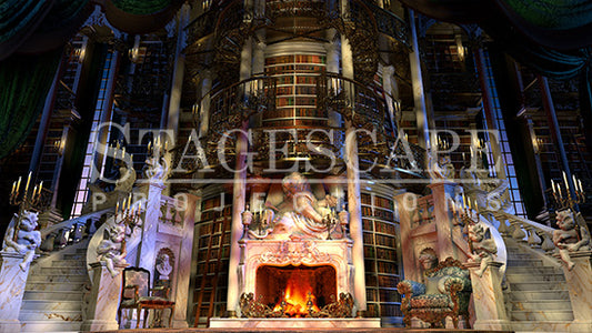 This elegant and intimate perspective of the Baroque Castle Library 2 immerses the audience in a grand yet personal moment within the scene. Designed for Beauty and the Beast, this setting enhances the tender connection between Belle and the Beast as they share stories by the warmth of the fire. The composition directs focus to the towering bookshelves, delicate marble staircases, and an opulent fireplace crowned by a sculpted lion, evoking both the grandeur of the castle and the intimacy of the moment.