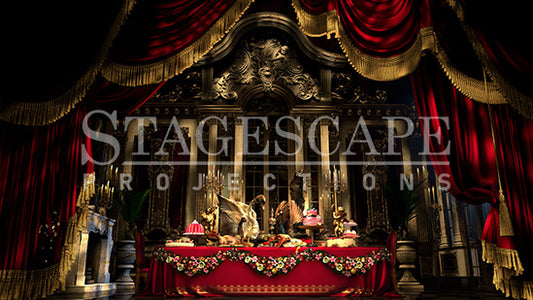 Transform your stage into an opulent fantasy with our Castle Dining Room digital backdrop, designed to bring the enchanting "Be Our Guest" scene from Beauty and the Beast to life. This richly detailed setting features a grand banquet table adorned with lavish floral garlands, ornate golden candlesticks, and an array of elegant dishes, all illuminated by warm candlelight. The backdrop is framed by luxurious crimson curtains with gold trim, revealing a regal dining hall with gilded mirrors, intricate architectural details, and soft beams of light streaming through tall castle windows. Perfect for capturing the magic and grandeur of a fairy-tale feast!