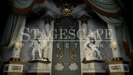 The Castle Library Door scene features a breathtaking baroque-style entrance framed by two marble statues. The detailed gold embellishments and cream marble columns reflect a sense of grandeur and elegance. Designed for Beauty and the Beast, this scene represents a pivotal shift in the production's visual storytelling, from the dark, gothic tones of Act 1 to the softer, lighter hues of Act 2. The warm cream and gold palette mirrors the evolving relationship between Belle and the Beast, symbolising hope and emotional transformation. The scene provides an opportunity to subtly brighten the stage, enhancing the emotional undercurrents of the story.