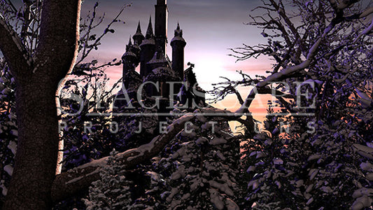 Through the frosty winter forest, the towers and turrets of the cursed castle rise proudly, their silhouettes stark against the bare branches.