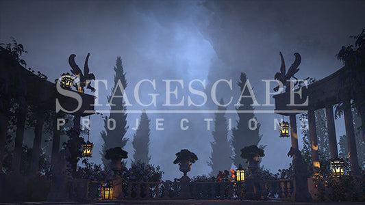 Immerse your audience in the enchanting mystery of the Beast’s castle with this stunning digital backdrop, perfect for Beauty and the Beast. Set against a vibrant sunset sky, this scene features an opulent garden adorned with ivy-draped pillars, glowing lanterns, and intricate stone gargoyles. Towering cypress trees and lush floral accents create an air of romance and magic, while the fading light evokes a sense of transformation and timeless wonder.