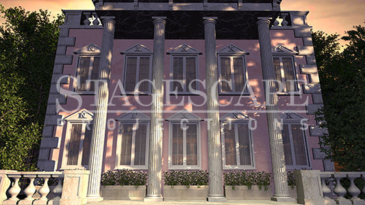 Designed for Legally Blonde, the Delta Nu Sorority House captures the iconic, candy-pink heart of campus life. This double-storey sorority house features soft pink walls, crisp white stone columns, and symmetrical rows of windows framed by leafy trees, instantly placing the audience in Elle Woods’ world. Bright, bold, and unapologetically glamorous, this scene establishes the playful tone of the show while giving the stage a strong sense of place, scale, and collegiate charm.