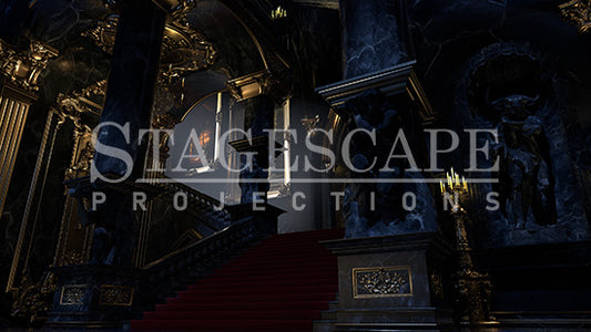 The interplay of scale, detail, and lavish materials creates an atmosphere of majesty, mystery, and Gothic opulence, perfectly capturing the essence of an enchanted castle. Whether used as a backdrop for a pivotal moment or a setting for dramatic transitions, this scene brings an unforgettable blend of elegance and fantasy to your production.