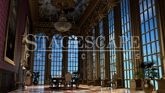 Step into regal elegance with this Palace Dining Room digital backdrop, perfect for theatrical productions set in opulent surroundings. This stunning scene captures the grandeur of a royal banquet hall, complete with soaring ceilings, intricate architectural details, and dramatic lighting that highlights the luxurious ambiance. Whether hosting a royal feast, an enchanting ball, or an intense confrontation between characters, this backdrop provides the perfect setting to transport your audience to a world of sophistication and majesty.