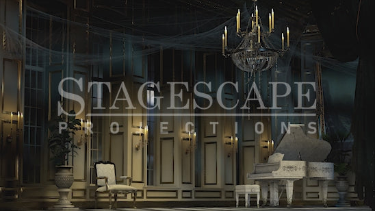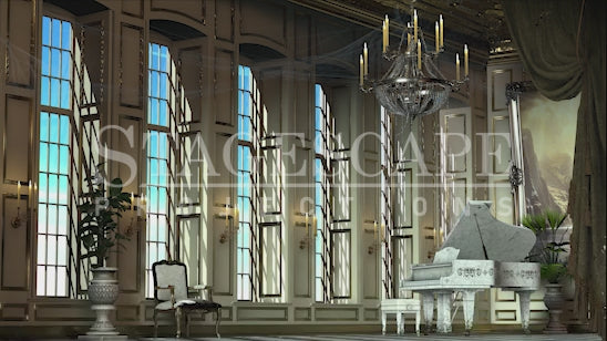 In the animated version, gentle candlelight flickers throughout the room, casting a soft, ever-changing glow across the space. Subtle movement enhances the feeling of a living, enchanted world, especially as the warm chandelier light bounces off the polished surfaces of the piano and surrounding décor.