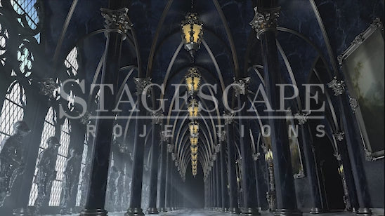 The animated version enhances the gothic stillness with subtle, cinematic motion. Candle flames flicker delicately, casting moving shadows over the stone columns and centuries-old portraits. Dust particles drift softly through the light, giving the hall a tangible sense of space, air, and age.